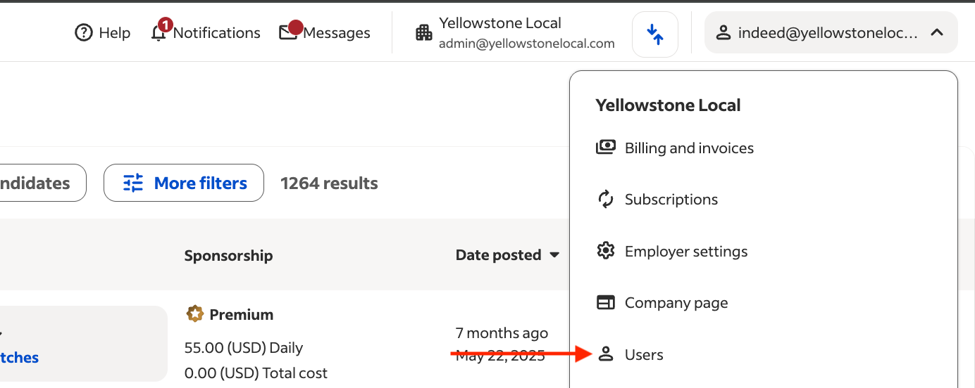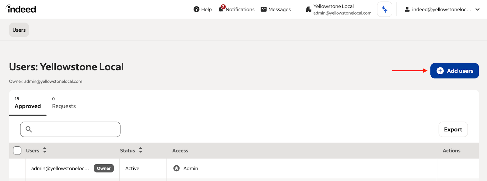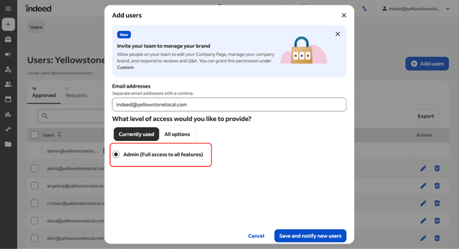 - Add our email indeed@yellowstonelocal.com, and give our user Admin access